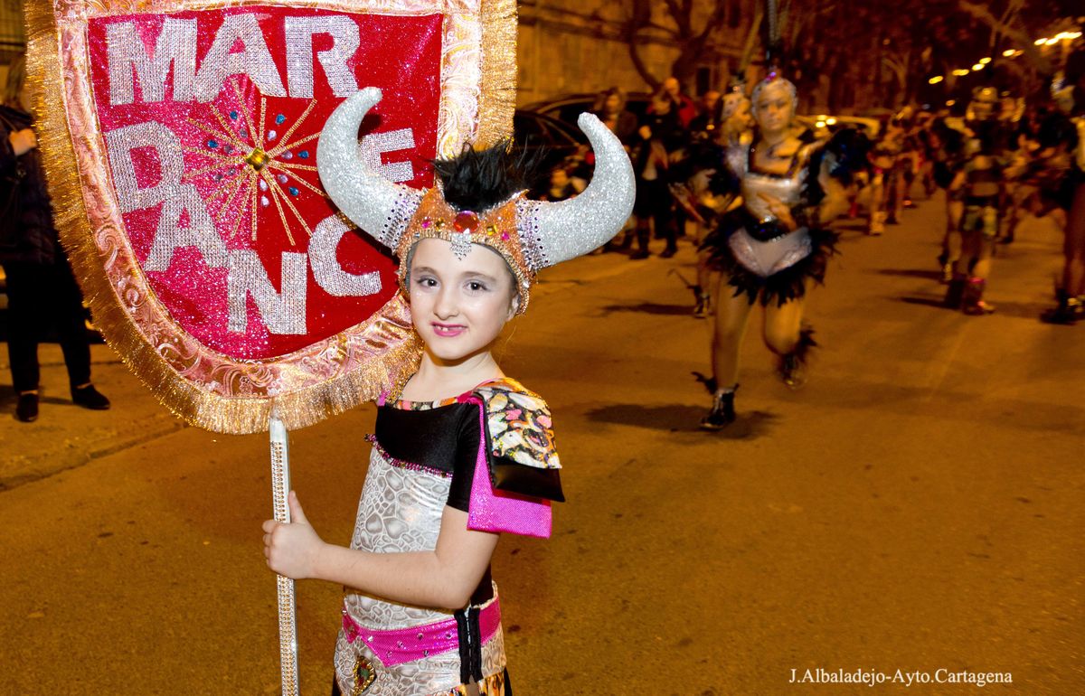 Integrantes del grupo carnavalero MarDance, de El Algar, en el desfile de la 'Quema de don Carnal' en la jornada de cierre del Carnaval de Cartagena.